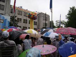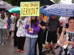 Vào khoảng 4:00PM mỗi người với chiếc dù nhỏ che trên đầu, chúng tôi đi trong mưa đến họp mặt với anh chị em trong cộng đoàn Vermont rồi cùng nhau tiến ra trướclễ đài nơi phát xuất cuộc rước Đức Mẹ. Tại đây mỗi giáo xứ hay cộng đoàn đều có một tấm bảng ghi tên cộng đoàn hay giáo xứ khi đi rước kiệu. Vì là lần đầu tiên tham dự Ngày Thánh Mẫu, cộng đoàn Vermont không được cung cấp tấm bảng này nhưng chúng tôi đã biết trứơc và đã tự thực hiện một tấm bảng tuy không đúng quy cách nhưng chúng tôi cũng đã có tấm bảng ghi tên cộng đoàn mình đi rước kiệu.
